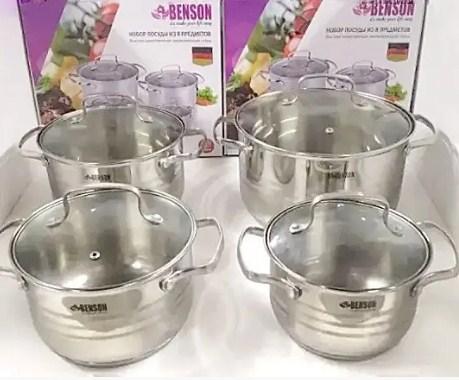 Набір каструль Benson виготовлений із високоякісної неіржавкої сталі. Посуд прекрасно передає та зберігає тепло під час приготування.
